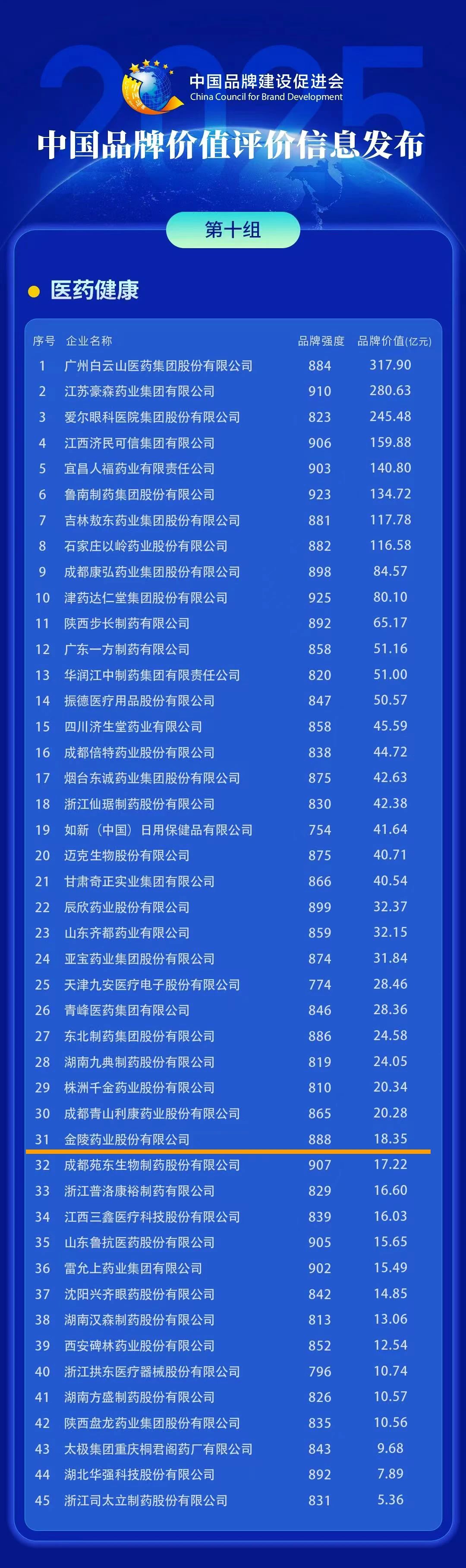 5月10日,由中國品牌建設促進會、中國資產評估協會等權威機構聯合發布的《2025中國品牌價值評價信息》揭曉,公司以品牌強度888分,位列醫藥健康類第13名,較去年躍升11...